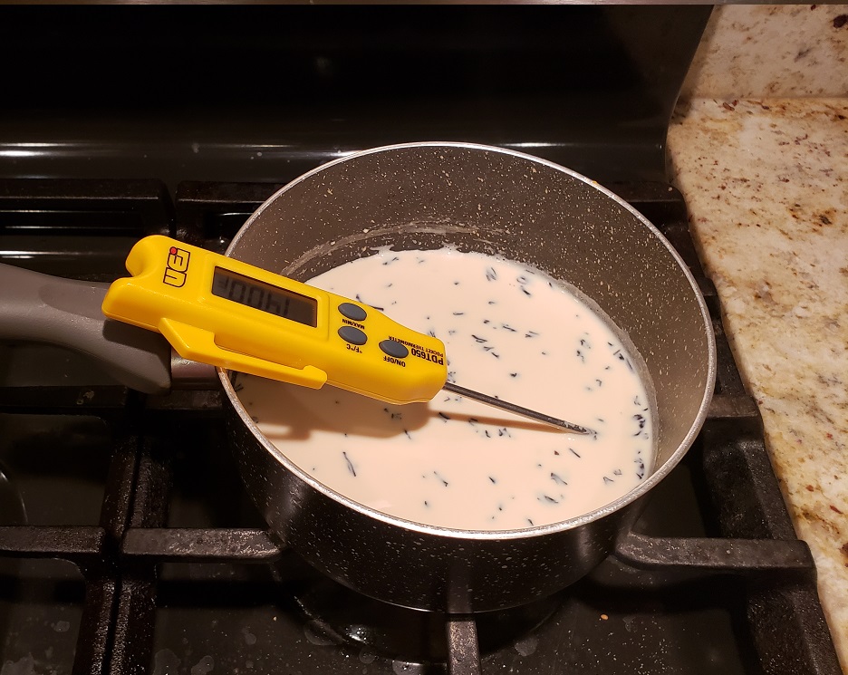Follow very similar steps as when creating regular plain yogurt. The only difference is when prepping the milk before adding the culture. I used only 1 cup of milk (actually 215 g so probably less than a cup) to conserve my ingredients. Assuming the tea would not provide a strong flavor, I used just over what I would normally use for a cup of tea. I added 2 heaping teaspoons of Earl Grey loose leaf tea or 3 teaspoons of Victorian London Fog (two batches) to the milk just as it reached peak temperature (185°F). Earl Grey tea is on the bitter end of tea already, so I made sure to steep for only 3 minutes in the milk. The milk changed color immediately, but did not get very dark. I poured the milk through my tea strainer and returned it to the pot to cool.