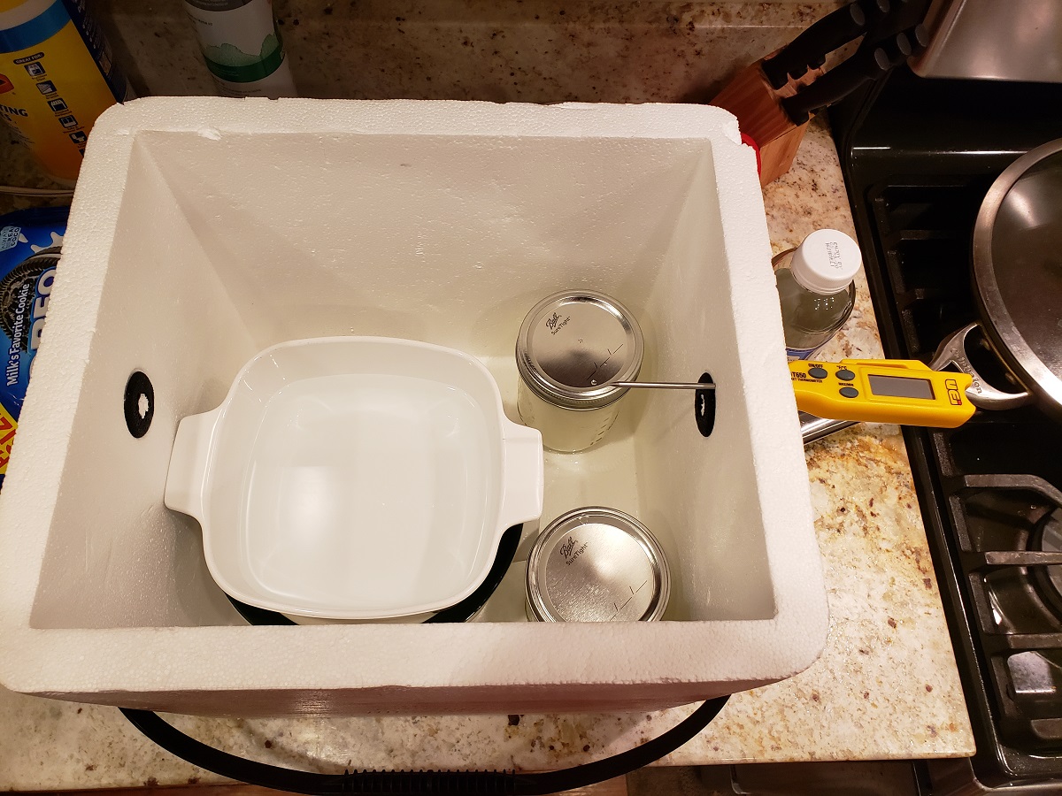At this point I decided to text my neighbor to give him an update...and learned a lot in short order.  He said he would culture at 114° and I should up my temperature.  He also leaves his overnight to culture at a lower temperature, but I plan to refrigerate mine overnight (not nearly as patient as he is...must be a trait you learn in your 50's).  Instead of continuing to fiddle with the oven, I searched our basement and found a styrofoam cooler that would be more convenient.  I boiled 1.5 liters of water and poured it into a ceramic dish to heat the two jars in the cooler.  The styrofoam walls allowed me to monitor the temperature by poking a thermometer through to the inside.  Since the soon-to-be yogurt was too cool, I maintained a temperature of 121° in the cooler for about an hour.  The temperature dropped to 110° for both the incubator air and yogurt so I refreshed the dishes with fresh hot water and closed it up again.
