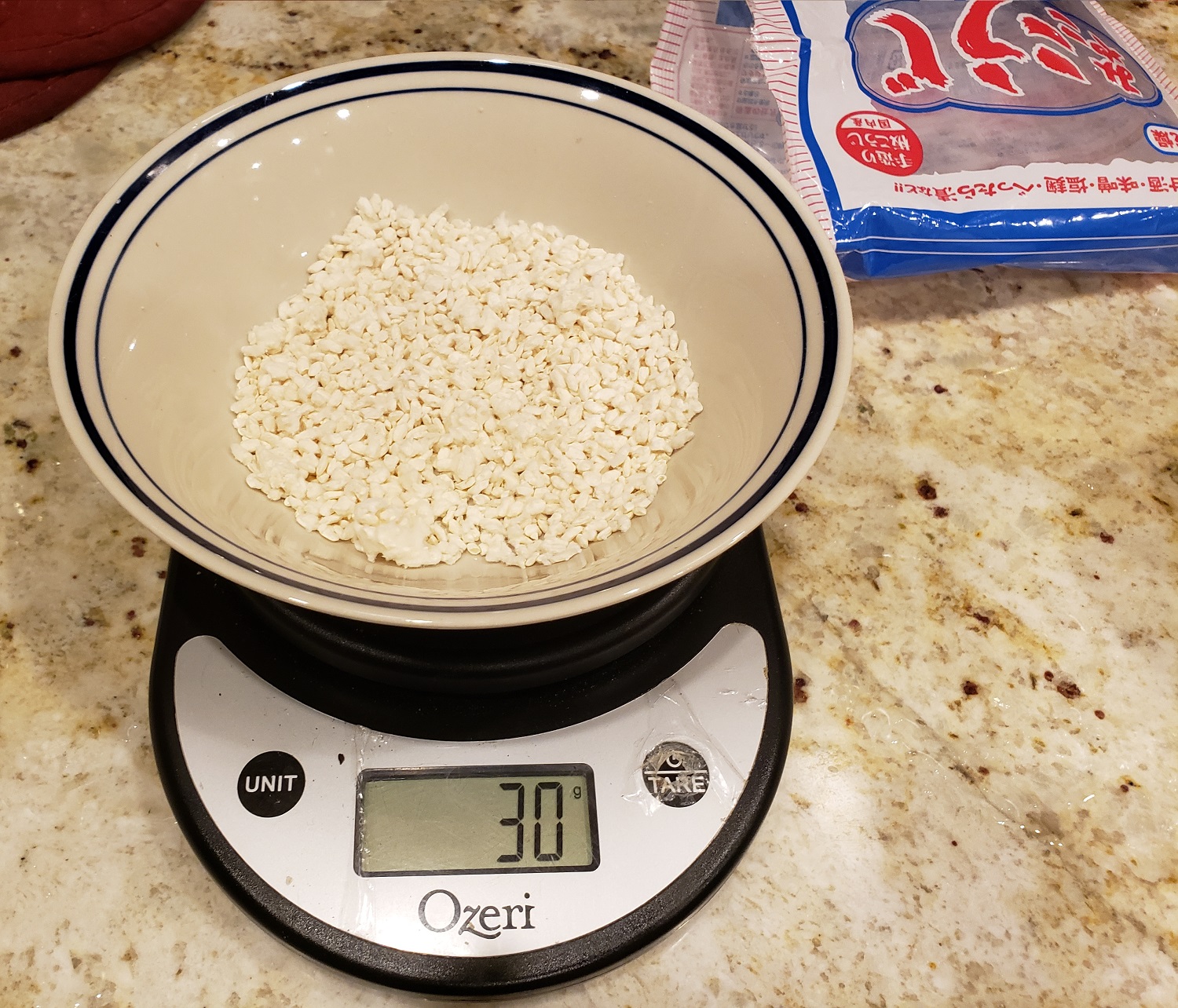 I only used 30g to make for a more round number to use for making miso.  The two cups of rice mentioned above made for a large bed for the koji.  I cooked it more than I would prefer to eat, assuming that the grains would open up a bit for the mold to get a strong foothold.  I wasn't very gentle with the rice or the koji.  They don't need whole rice grains to grow, they will be happy with just about any substrate.