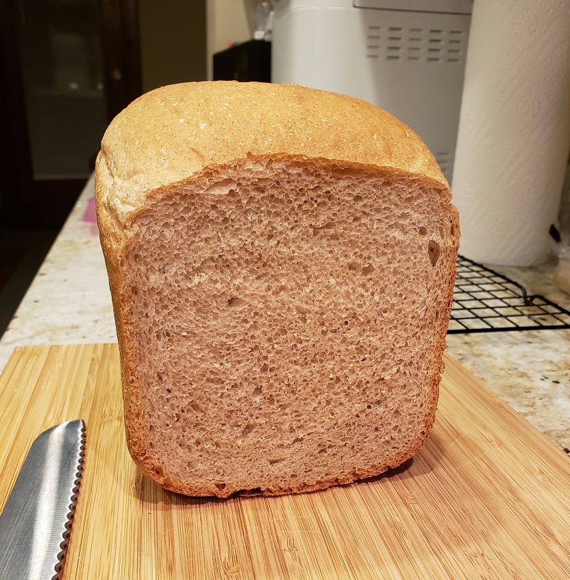 Shown on the left is my standard 1/3 wheat sandwich bread from the recipe above. The crust is not too thick that it hinders eating a sandwich and the interior is strong enough that the bread doesn't fall apart. You can bake it much darker than this, but it makes for less ideal sandwiches. I add about 1 tablespoon of canola oil to each loaf and cut the butter to just under 2 tablespoons (the oil helps the bread stay soft).