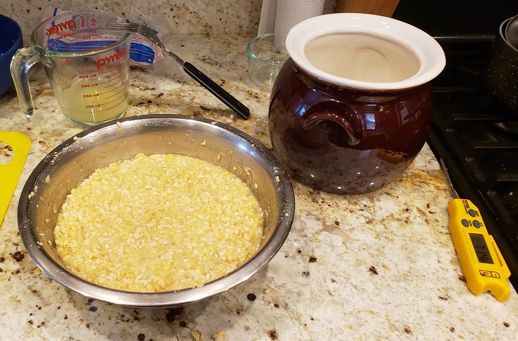 Not quite. Mashing the beans was much more difficult than I thought when unaided by a potato masher. I made do with a fork at first, but quickly switched to chopping with a knife. After getting it all processed, I mixed in the koji and saltwater before transferring everything into my fermentation crock/cookie jar. I sprinkled some extra salt onto the surface as a protective layer.